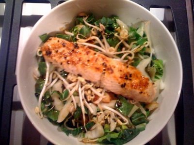 I apologize if the picture is a little blurry… the lighting was poor and I was trying to use my iPhone. This is the outcome of the Bok Choy salad mentioned yesterday. It was absolutely delicious and worked beautifully with the grilled salmon (which I just seasoned with a little lemon pepper and some salt).