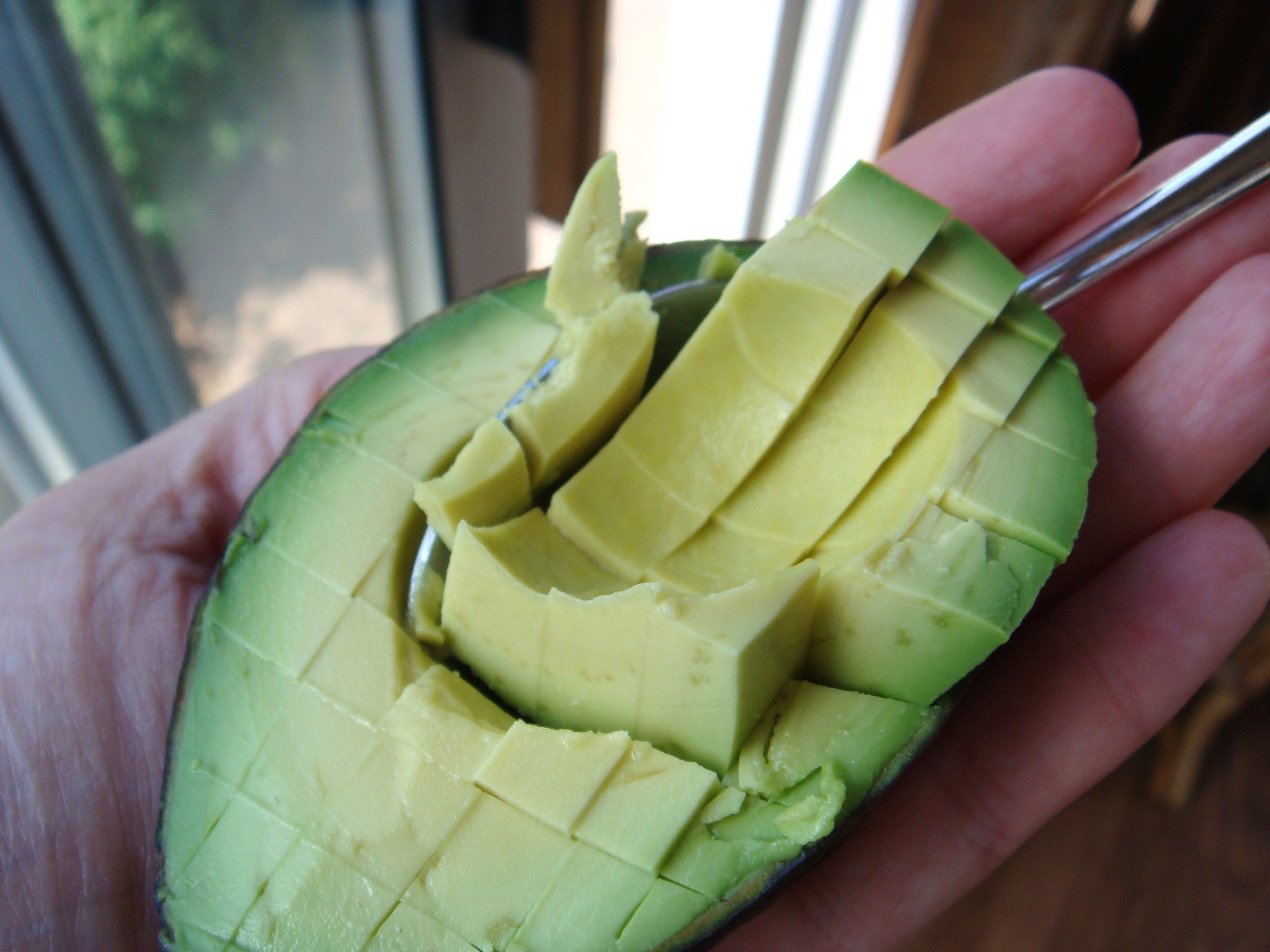 Not sure how to cube an avocado? Couldn’t be easier (as long as it’s ripe). Using a sharp knife and being very careful not to slice through the peel into your hand — slice avocado lengthwise and then crosswise into desired cube sizes. Use a spoon to carefully lift the sliced avocado out of it’s peel: