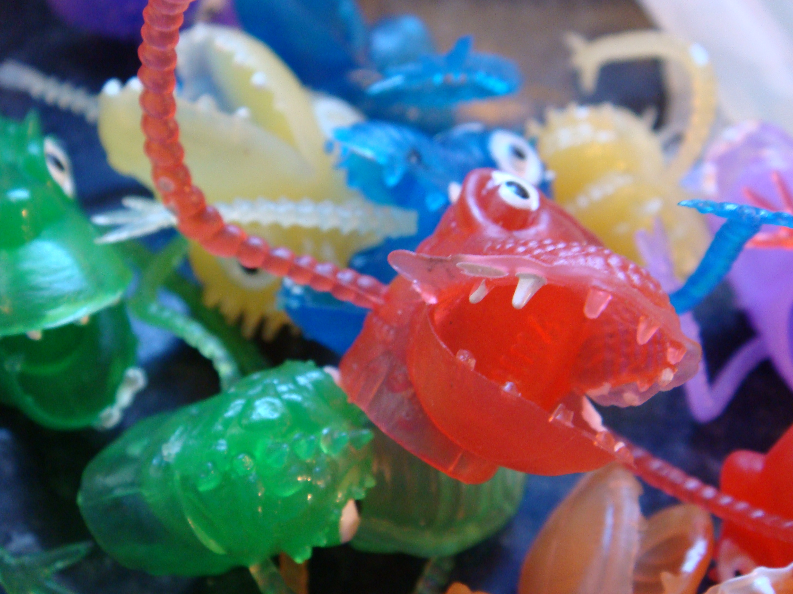 I filled them with mini dragons, NECCO wafers, Matchbox cars, gummy “bug parts”, food-themed erasers, monster finger puppets, glow sticks, “Smencils” (VERY cool, smelly pencils, that are made out of 100% recycled material) and planet-themed party blowers.