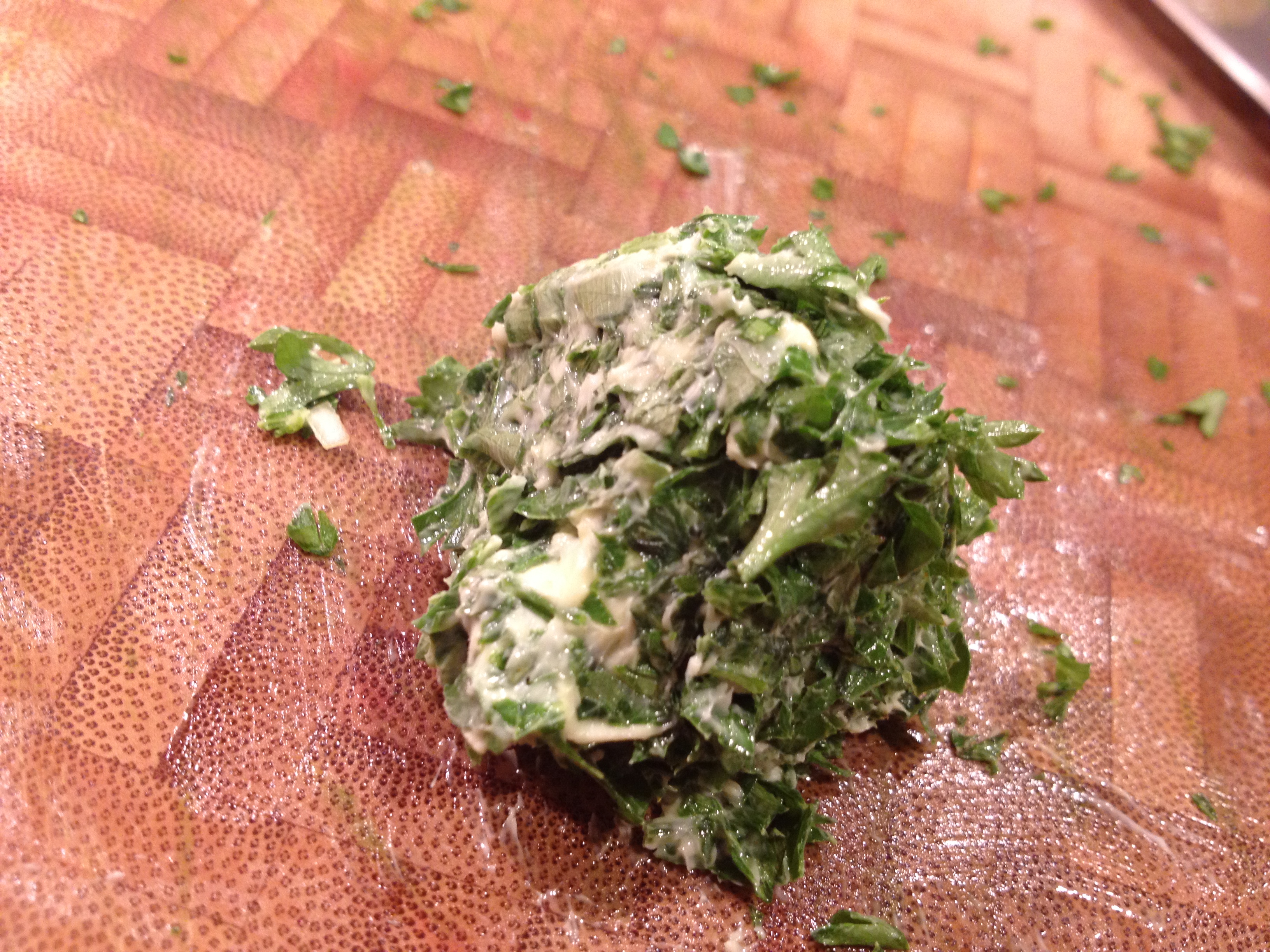 And instead of melting the butter and following the steps you’ll find in the original recipe, I let my butter warm up just a tad at room temperature and then I mashed the parsley directly into the butter, making a paste that I formed into a ball.
