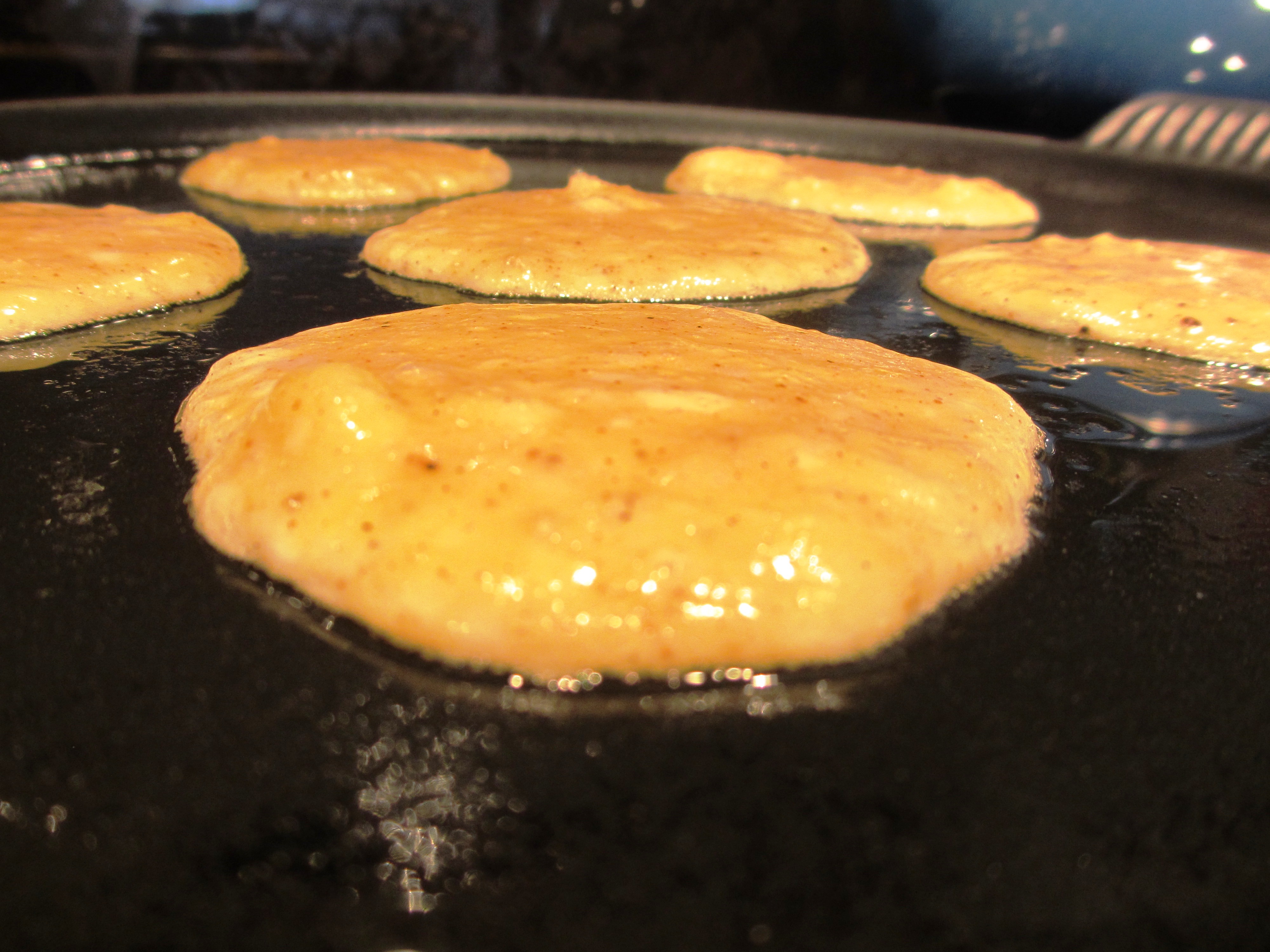 When I poured the first four scoops of batter in, I was like “Hmmm….”, as they didn’t look too appetizing and ran to the edges of the pan. The batter was very thin and watery. I cooked these for about 4 minutes on medium heat for the first side. When I flipped them, they still didn’t seem perfectly cooked: