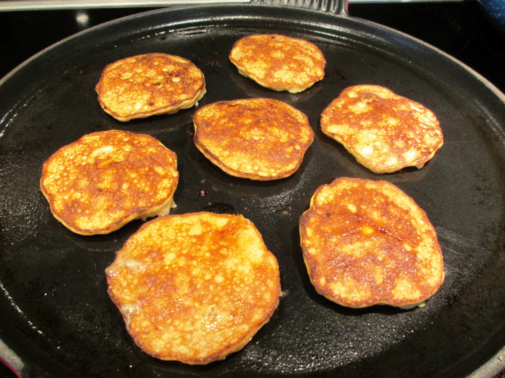 Each batch took less and less time because I was using a cast iron griddle pan — which retains it’s heat very well. Batch #1 took almost 4 minutes per side in a non-stick frying pan. Batch #2 was about 3 minutes per side and batch #3 was a little less than that…