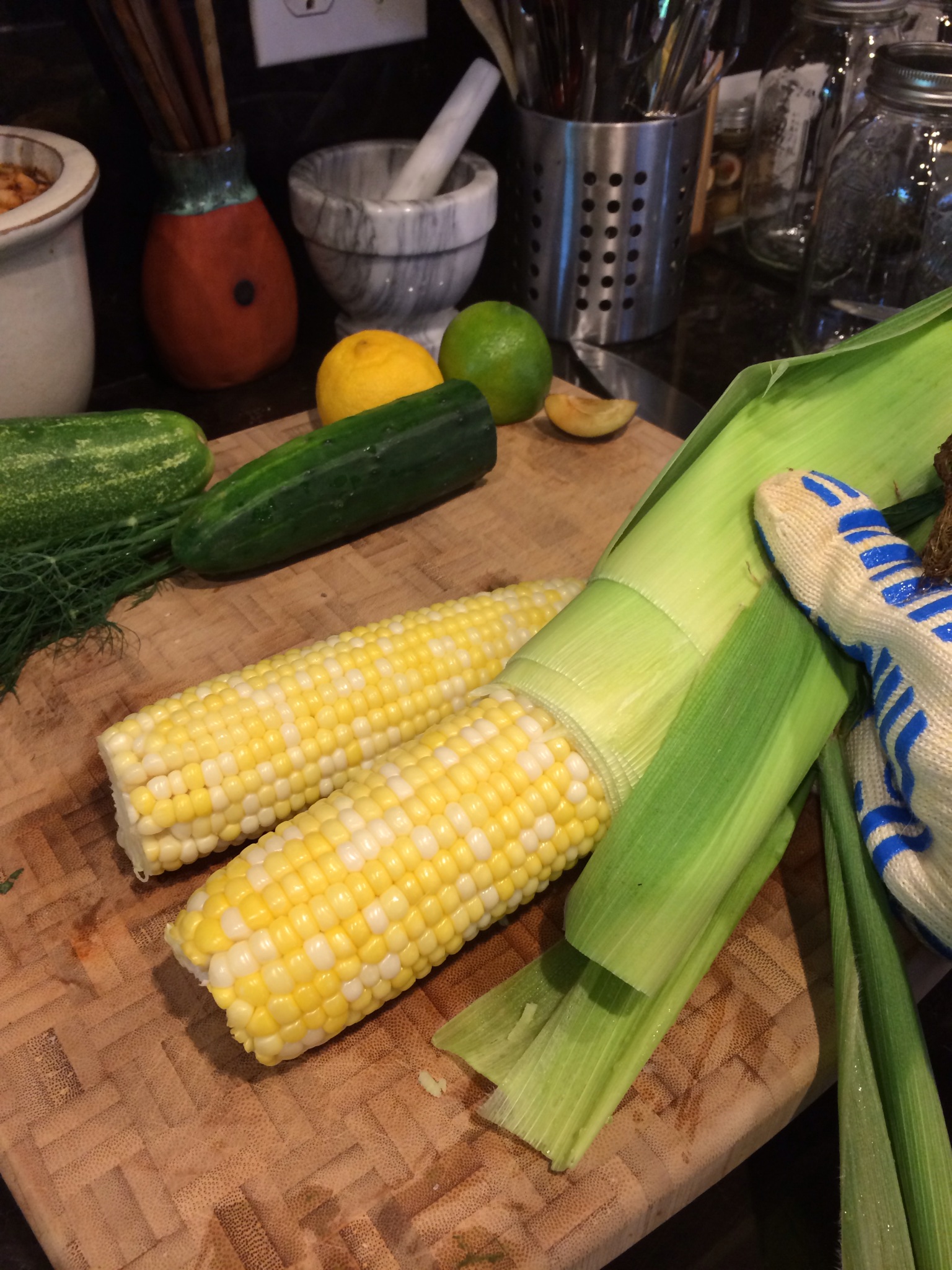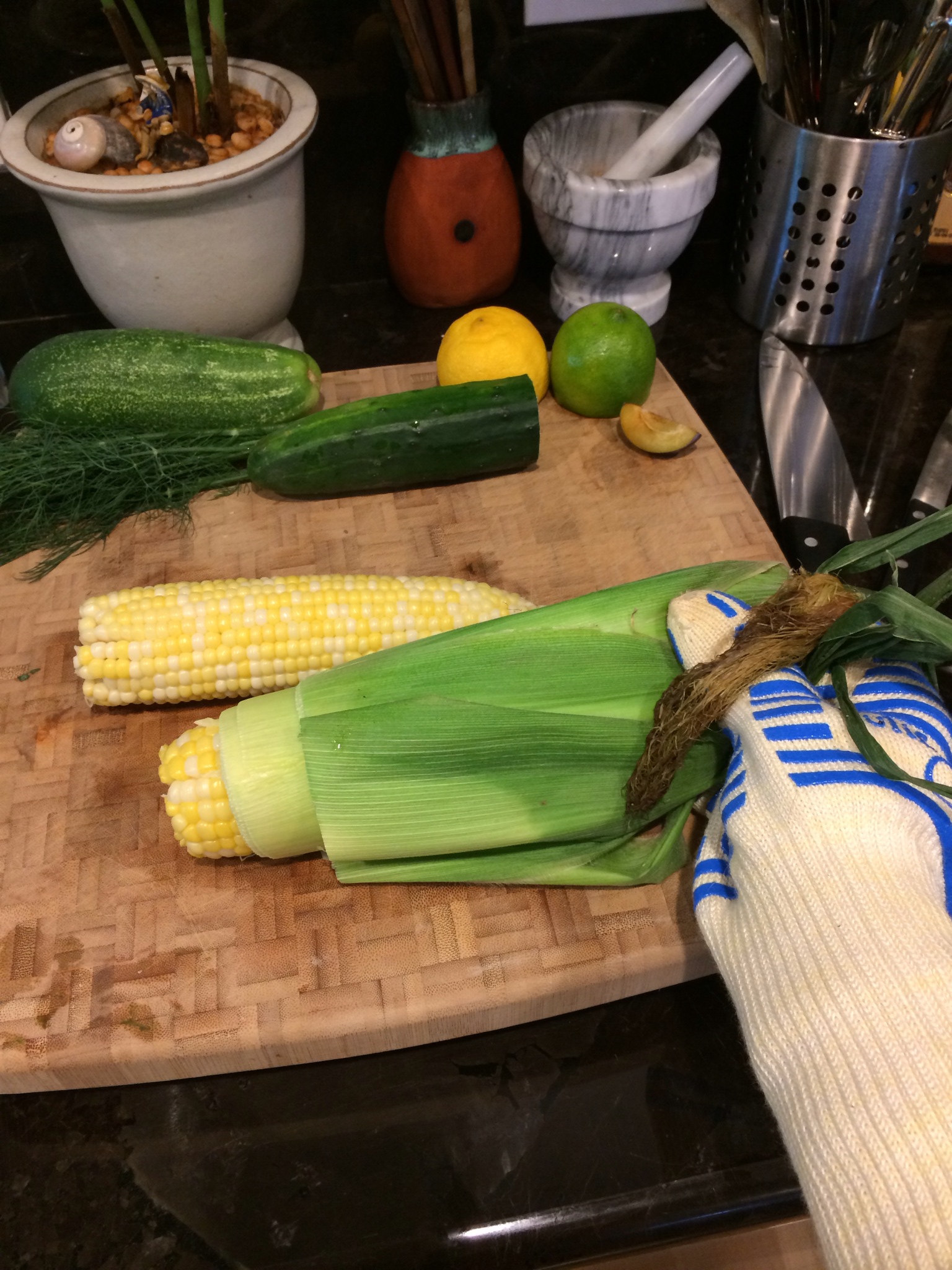 Using a towel or oven mitt, grasp the silk end of the ear and gently begin pinching the husk… essentially “squeezing” the cob out.